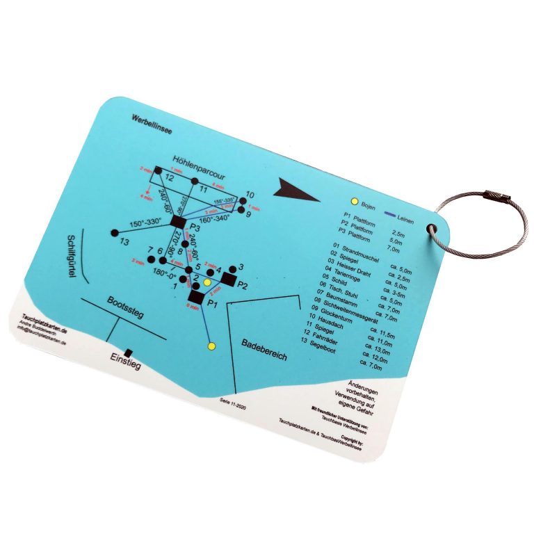 Die Tauchplatzkarte „Werbellinsee“ besteht aus einer bedruckten Polystyrolplatte mit den Abmessungen von 183 x 127 x 1 mm. Die Vorderseite zeigt die Seeskizze, die Rückseite zeigt ein Logo der örtlichen Tauchbasis.